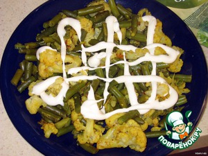 Выложить цветную капусту и стручковую фасоль на большую тарелку, полить сеточкой майонезом.