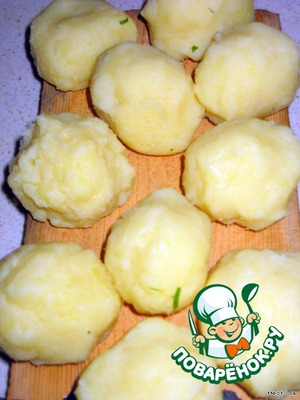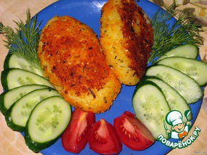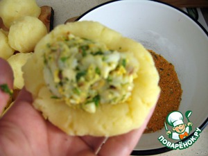 Сделать из картофеля лепешечки, на середину положить рыбную начинку, завернуть края, сформировать котлетки.