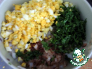 Измельчить вареное яйцо и зелень. Лук почистить, мелко порезать и обжарить. В миску к рыбе добавить измельченные яйцо, зелень, обжаренный лук, приправить солью и перцем по вкусу. Хорошо все перемешать.