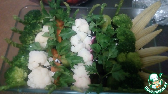 Овощи можем выбрать любые, небольшие по размеру. Это могут быть маленькие морковки, свеколки, цветная капуста или брокколи, редиски, маленькие репы или спаржа. Отлично смотрится брюссельская капуста. У корнеплодов лучше постараться оставить небольшие хвостики – черенки. Капусту нужно разделить на соцветия.