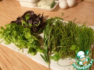 Мою зелень (кстати можно добавить травы по вашему вкусу, я только не советую добавлять розмарин, слишком сильный вкус, забьет все остальное) и мелко режу, у тимьяна обдираю листочки.