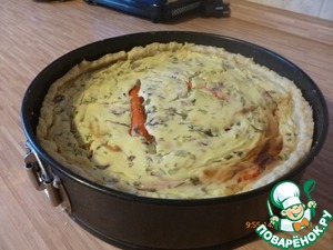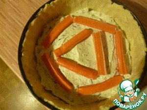 На тесто кладу 1/3 часть начинки, затем половину крабовых палочек, потом еще 1/3 сырной массы и оставшиеся крабовые палочки. Сверху разравниваю оставшейся начинкой.