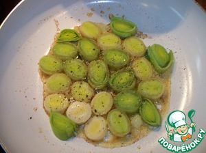 • Лук-порей режем и тушим в сливочном масле минут 5.