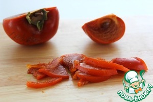 Хурму нарезать на четвертинки, удалить косточки и нарезать тонкими пластинками