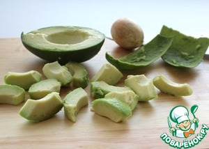 Авокадо разрезать пополам, удалить косточку, очистить от шкурки, нарезать крупными поперечными ломтиками