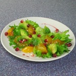 На овощную подушку из листьев салата выложить, чередуя, ломтики авокадо и хурмы. Посыпать зернами граната, полить заправкой.