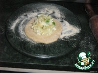Делаем колобок из теста обмакиваем в муку, слегка раскатываем, кладём начинку на середину. |