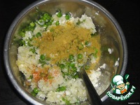 Картофель и панир трём на тёрке, горошек слегка отвариваем и приминаем ложкой, режем зелень, добавляем соль, порошок кориандра и красного перца, всё перемешиваем. |