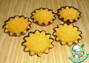 Равномерно распределить тесто в формочках, предварительно слегка смазанных растительным маслом. Выпекать тарталетки в духовке при температуре 170-190 градусов 15-20 минут.