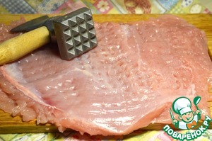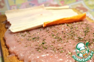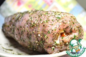 Филе свернуть аккуратно рулетом и закрепить. Обычно я обвязываю рулеты зубной нитью, она не плавится, не горит, никакого мятного вкуса на мясе не оставляет и легко снимается, не повреждая мясо. Рекомендую ))) Подготовленный рулет замариновать в подготовленной смеси и дать постоять хотя бы 15 минут.
