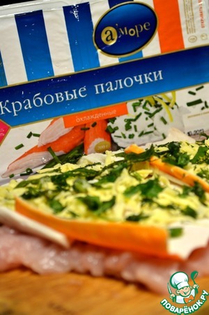 На внутреннюю часть (где нет пленочки) нанести немного маринада, развернуть крабовые палочки, выложить внахлест по всей ширине пласта филе