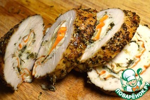 Нарезаем на порционные кусочки шириной около 1-1,5см и подаем к столу. Если Вы хотите использовать рулет в качестве закуски или как полезное мясо для бутербродов, то следует дождаться его остывания и нарезать тоньше. В таком случае в качестве дополнительного соуса отлично подойдет зернистая горчица.