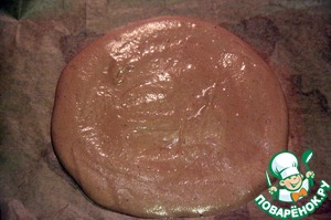 на бумаге для выпечки рисуем круг 24 см, делаем первый корж и отправляем на 15-20 минут в духовку.