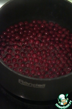 Пока готовятся коржи, воду (100 мл) смешайте с сахаром (100 гр) и сварите сироп, залейте им 100 гр смородины. Эрме рекомендует оставить смородину на ночь, но у меня времени не было, я использовала ее через пару часов. -