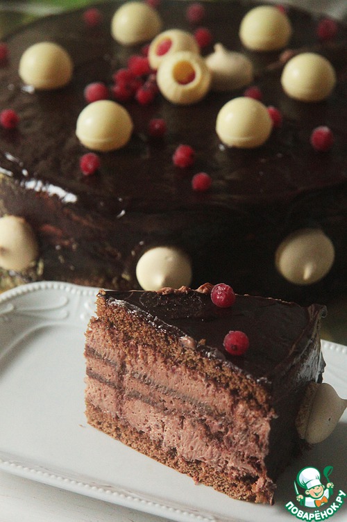 В холодильнике была красная смородина, масляный крем я не ем, а бисквит без муки получился невероятно хрупким, поэтому я укрепила торт шоколадными бисквитами, которые готовила заранее, вы можете использовать любой рецепт, который любите.