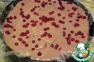 Начинаем собирать торт. Разъемную форму выстелить пищевой пленкой, выложить вниз корж, сверху выкладывайте крем и ягоды смородины. Так собираете полностью торт и отправляете на ночь в холодильник.