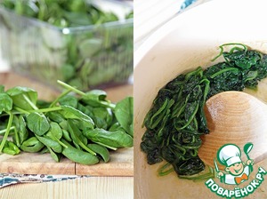 Для начала подготовим шпинат. Для этого возьмем молодые листья и потушим минут 5 со сливочным маслом, немного подсолив.