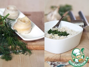 Теперь рыбка... У меня было филе камбалы, Вы можете выбрать рыбу по своему вкусу. Итак, мы берем филе, проворачиваем в мясорубке и смешиваем со сливками или молоком, мелко нарезанным укропом, солью и чесноком, пропущенным через чеснокодавку.