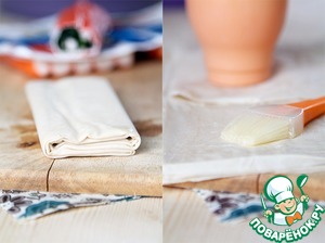 Возьмем тесто, разрежем на прямоугольники размером примерно 15х20-см, должно получится рАвное количество. Оставшееся сливочное масло растопим в микроволновой печи, листы теста разделим на две части и сложим, промазывая маслом.
