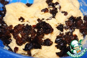 Из масла, муки, желтков, соли, сахара, разрыхлителя, нарезанного мелкими кусочками чернослива 120 г и соли замесить однородное тесто. Если тесто не собирается, добавить пару ложек воды.