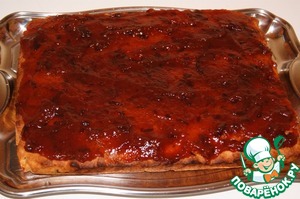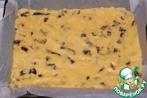 Выстелить тесто в форму 20х30 см, застеленную пекарской бумагой, и выпекать в прогретой до 180*С духовке 20 минут. Ориентируйтесь на вашу духовку!