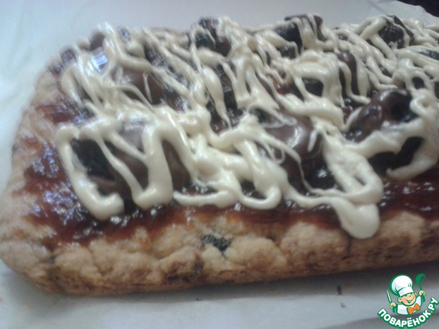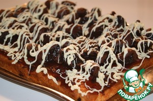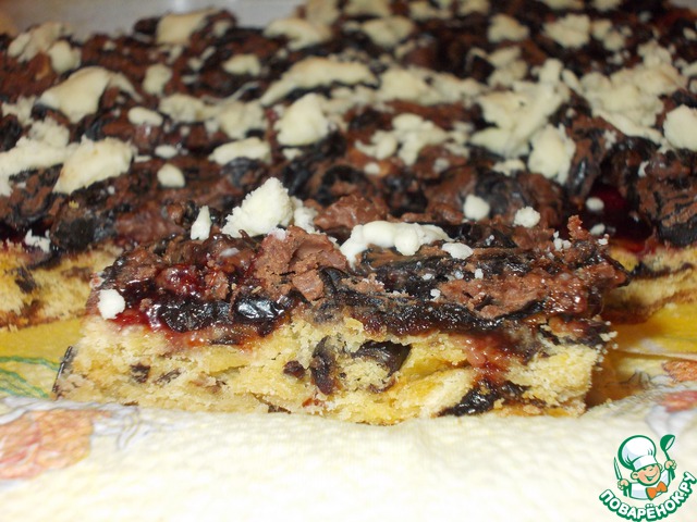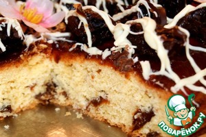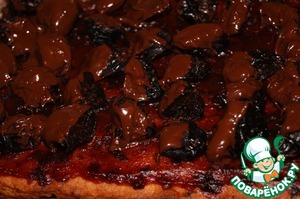 Чернослив 200 г разрезать на половинки и, обмакивая в растопленный шоколад, сразу же выстелить им верх пирога.