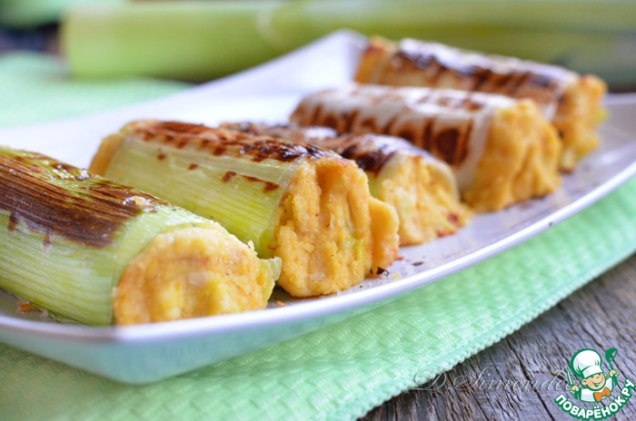 Рецепт «Порей, фаршированный хумусом и адыгейским сыром на гриле»: