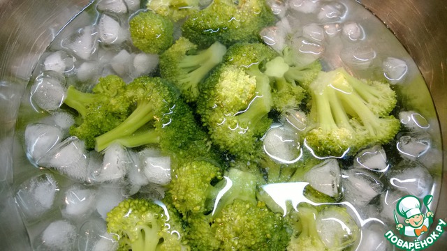 • Заранее подготовьте холодную воду со льдом. С помощью шумовки достаньте брокколи и сразу поместите в холодную воду на 5- 10 минут.
