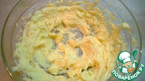 • Масло (комнатной температуры) взбить миксером, добавить сахар и продолжать взбивать до пушистости.