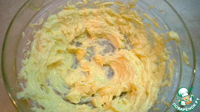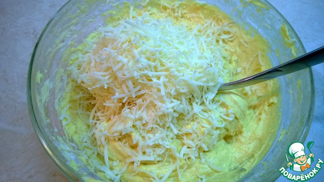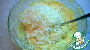 • Соеденяем обе массы и добавляем натертый на мелкой терке сыр Чеддер.