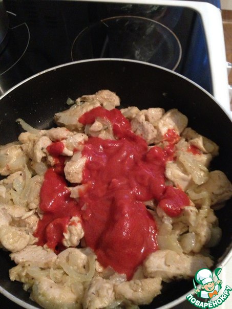 Самое интересное - соус! В оригинальном рецепте вместо томатной пасты используется томатный сок, у меня его не оказалось, поэтому я разводила томатную пасту кипяченой водой.