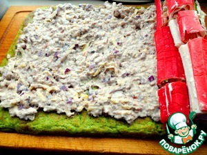 Выкладываем паштет на готовый корж, на него по одному краю выкладываем фаршированные крабовые палочки и сворачиваем все, аккуратно прижимая рулетом.