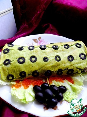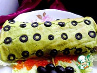 Даем рулету постоять и пропитаться в холодильнике. Подавать к столу, нарезав кружочками с солеными маслинами. Приятного аппетита!