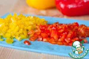 По четвертинке красного и желтого перцев нарезать мелкими кубиками.
