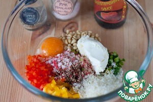 В миске смешать все нарезанные продукты, добавить кедровые орехи (их нужно слегка поджарить и измельчить), 1 яйцо, панировочные сухари, соль, перец, вустерский соус и маскарпоне.