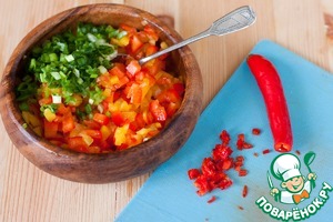 Смешать манго, красный и желтый перцы, добавить нарезанный зеленый лук и перец чили.