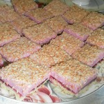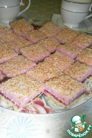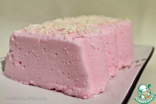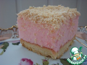 Нежнейший десерт, состоящий из песочного основания, увенчанного пушистым зефиром приятного розового цвета, и украшенный поджаренной стружкой кокосового ореха. Рецепт найден мной на английском сайте.