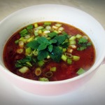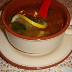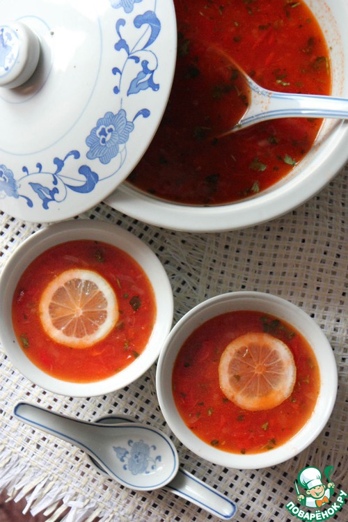 После чего влить в суп столовую ложку лимонного сока, бросить остатки нарубленных петрушки и кинзы, перемешать и разлить по тарелкам, положив в каждую тонкий ломтик лимона или лайма. Приятного аппетита!