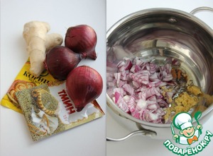 Мелко нарубленный красный лук обжарить в сотейнике на оливковом масле с тертым имбирем, молотой корицей, семенами тмина, паприкой. Обжаривать до сильного запаха жареного лука и специй, но не пережечь.