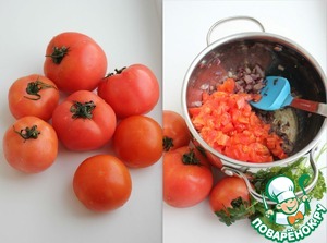 Помидоры мелко нарезать (можно избавиться предварительно от кожицы и семян, но это для слишком деликатных поваров) и добавить к луку.