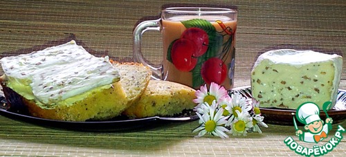На завтрак вкусные бутерброды, намазанные маслом, с кусочком сыра с белой плесенью и орехами.