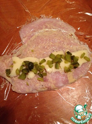 На стол кладем пищевую пленку, грудку; сверху режем сыр грамм 30, и мелко рубим 2 корнишона.