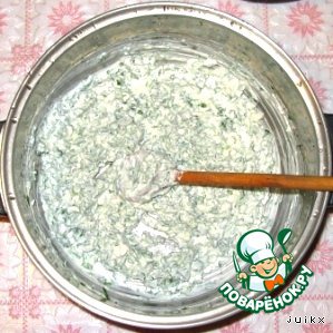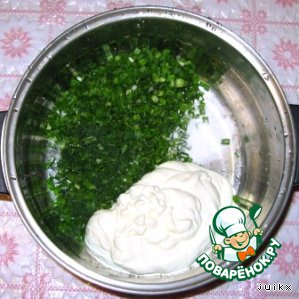 В кастрюлю (у меня на 6 л) выложить зелень и лук, вылить сметану.