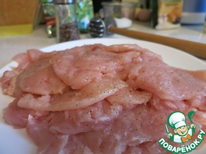 Грудки отбиваем и режем на порционные кусочки. Солим, перчим и оставляем немного замариноваться.