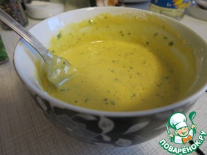 Тем временем готовим яичную смесь. Для этого смешаем яйца, сметану, муку, зелень. Немного солим и перчим. Не забываем, что сыр тоже добавит блюду солености.