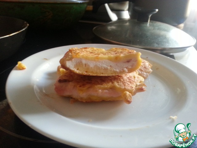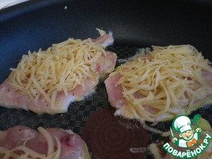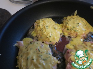 На отбитый кусочек мяса наливаем ложку кляра и выкладываем отбивную на сковородку с разогретым маслом яичной стороной вниз. Сверху посыпаем тертым сыром и аккуратно заливаем сверху кляром.