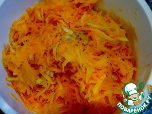 Тыкву, морковь, картофель натереть на крупной тёрке и отжать.