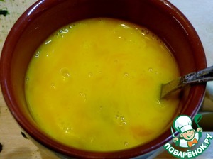 Добавить муку, перемешать. Яйца взбить вилкой