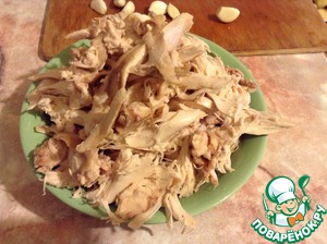 Через 4 мин. добавить орехи и немного бульона. Дать закипеть и добавить специи, чеснок и муку. Посолить. Тушить до готовности орехов и добавить в казан с мясом курицы.