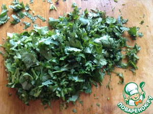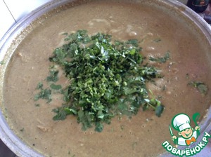 Добавляем лимон (у меня лайм) и уксус для гашения горького вкуса орехов. Добавляем соль по вкусу. Даем закипеть и добавляем кинзу. Через 3 минуты выключаем плиту, накрываем крышкой и оставляем на сутки. -